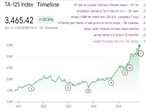 - את נקודת הפתיחה של ה'ראלי' הנוכחי אפשר לסמן ב-19 בספטמבר 24', יומיים לאחר 'מבצע הביפרים' שפגע באלפי פעילי חיזבאללה בלבנון וסוריה. ב-14 החודשים שחלפו מאז זינק ת"א 125 מרמה של 1,991 נקודות עד לשיא הנוכחי שלו, 3,465 נקודות – זינוק של כ-74%.