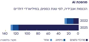 הגרף המצורף כאן יכול להסביר חלק מההצלחה של אנבידיה בשנים האחרונות. הוא מראה כיצד הכנסותיה צמחו בתוך 4 שנים מכ-27 מיליארד דולר לכ-130 מיליארד דולר בשנה. הגידול כולו מיוחס לשוק השבבים שמיועדים למרכזי עיבוד נתונים. אלו בעיקר מרכזי נתונים שבהם מחזיקות חברות הטכנולוגיה הגדולות כמו מיקרוסופט, גוגל, פייסבוק ואמזון. הן המשקיעות הגדולות ב-AI כיום והמנוע המרכזי לצמיחה של אנבידיה.